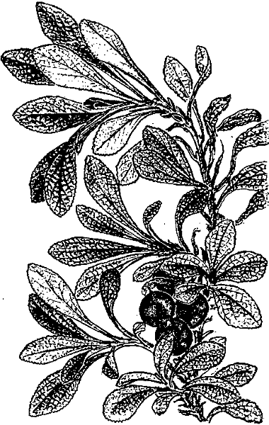 Арктоус альпийский — кустарничек с распростертыми стеблями, слегка возвышающимися над почвой. Небольшие овальные листочки мелкоморщинисты, а по краям — зубчаты. Цветочки маленькие, как опрокинутые кувшинчики, слегка розоватые, собраны в редкое кистевидное соцветие. В висячих цветочках пыльца из пыльников рассеивается вниз через особые трубочки-выросты (рис. 25). Зацветает арктоус рано, едва сойдет снег. Осенью тундра с зарослями арктоуса преображается: листья становятся фиолетово-красными, а на их фоне — букет плодов (вначале красных, а потом совершенно черных). По виду плоды напоминают бруснику, но это сочные костянки — мучнистые и безвкусные. Их с удовольствием поедают птицы и медведи. У человека они вызывают ряд болезненных явлений, а иногда и рвоту.