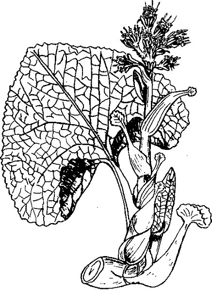 Полноправный синоним родового имени этого растения — подбел. Оба названия прекрасно характеризуют морфологическую особенность растения. Очень крупный округло-сердцевидный лист (как копыто) с нижней стороны имеет серовато-шерстистое опушение. Не только листья (все они прикорневые) оригинальны, но и развитие белокопытника. Первыми весной, в апреле-мае, появляются не листья, а мясистый цветонос, унизанный цветочными почками, которые быстро распускаются. Множество трубчатых цветочков (красноватых, грязно-пурпуровых) собрано в корзинки, которые образуют мощное кистевидное соцветие (рис. 27). И только после окончания цветения появляются листья, достигающие в благоприятных условиях очень крупных размеров (25?35 см), и поднимаются они на высоту до 60 см. В пору полного развития листья напоминают перевернутые зонтики. Белокопытник — многолетнее корневищное растение; нередко он образует заросли, своим буйством вызывающие ассоциацию с чем-то древним, мезозойским.