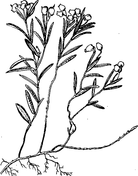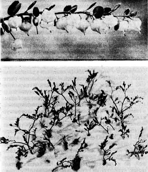 Подбел — многолетний вечнозеленый кустарничек высотой до 30–40 см. Интересны у него листочки. Они небольшие, узенькие, с завернутыми вниз краями. Верхняя часть пластинки ярко-зеленая, а нижняя — матово-белая от воскового налета. Это и дало растению его название — подбел. Зацветает он уже в мае. Его розовые кувшинчатые поникающие цветочки сидят на длинных цветоножках и собраны в зонтиковидную кисть. Часто в одной популяции можно встретить все оттенки розового: от яркого до почти белого. Обычно бутоны окрашены ярче, а стареющие цветы — бледнее. Подбел великолепно приспособился к жизни на сфагновых болотах. Болото растет вверх, и подбел поднимается вместе с ним. Его обильно ветвящиеся придаточные корни все время как бы следуют за ростом сфагнов, от старых побегов наклонно вверх отходят молодые корни и побеги (рис. 47).