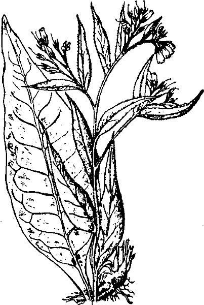 Окопник лекарственный — многолетник с сильным ветвистым (как бы граненым) стеблем и крупными ланцетными листьями, из которых верхние — сидячие, а нижние — на черешках. Корень у него толстый темно-бурый. Цветы некрупные и неяркие, собранные в метельчатое соцветие, называемое завитком (рис. 45). Интересную особенность имеют цветы окопника: в начале цветения они пурпуровые или фиолетовые, а в конце — синеватые или даже голубоватые. Цветение его продолжается с мая по август.